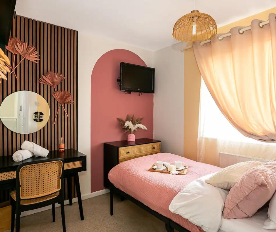 The room is situated on the ground floor and is well equipped with everything you may need for a comfortable, short or longer stay: a double bed, two bedside tables with bedtime lamps, a desk with drawers, chair and desk bin, a chest of six drawers, wardrobe with two shelves and plenty of hangers, your own under-counter fridge with small freezing compartment, and direct entrance to the enclosed back garden. We also provided coat hangers to help you make full and effective use of the space. Set of two towels is provided for each guest at the beginning of the stay. Extra towels are available for an extra charge. You will also find a small electric kettle, and welcome pack containing standard and decaff coffee, tea, brown and white sugars, milk sachets and some biscuits to help you warm up after your travel and fully enjoy your self check-in experience in our stylish interiors.